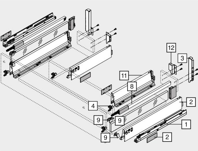 Для алюминиевого фасада необходимо использовать релинги для внутреннего ящика (левый и правый) и дополнительные крепления.